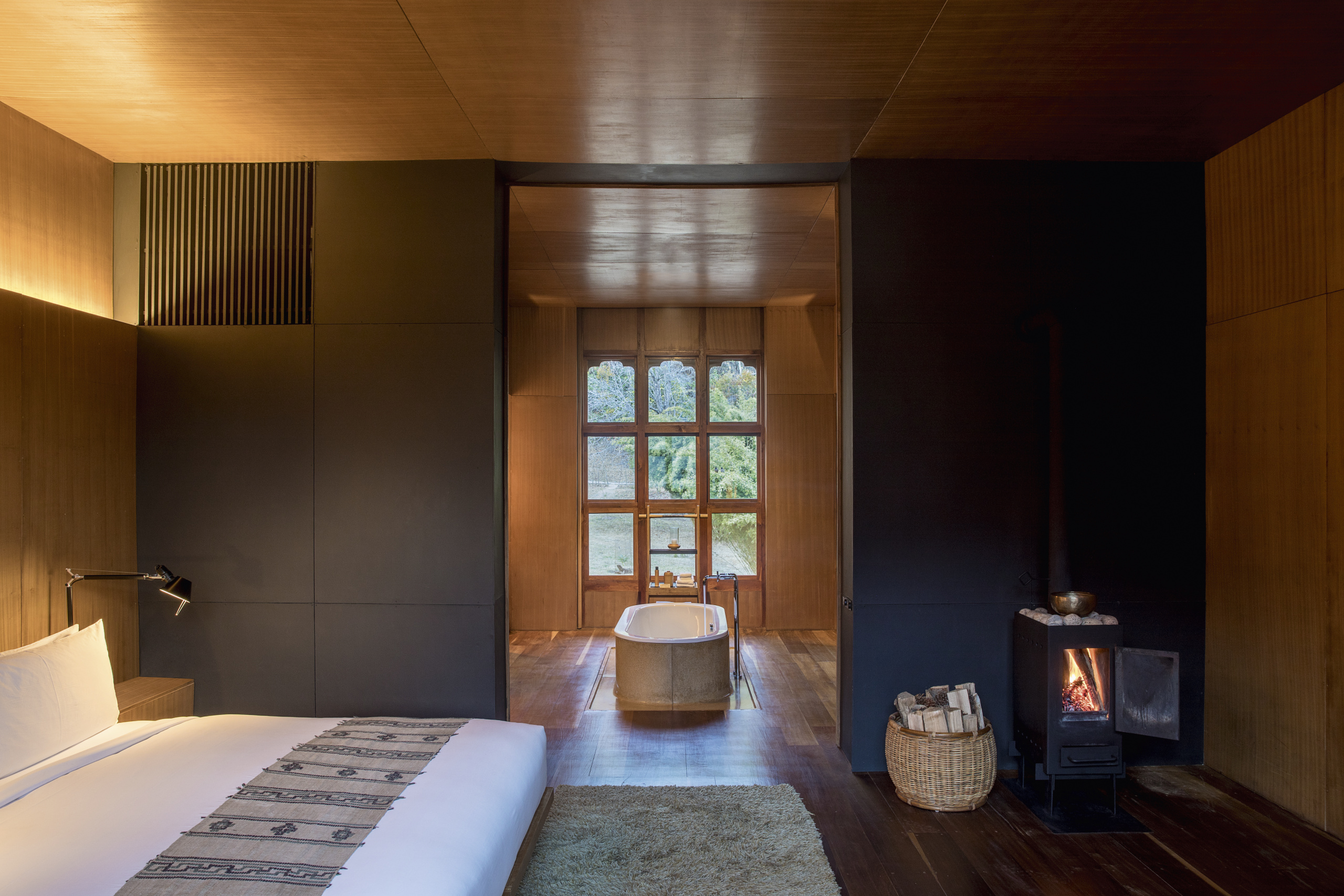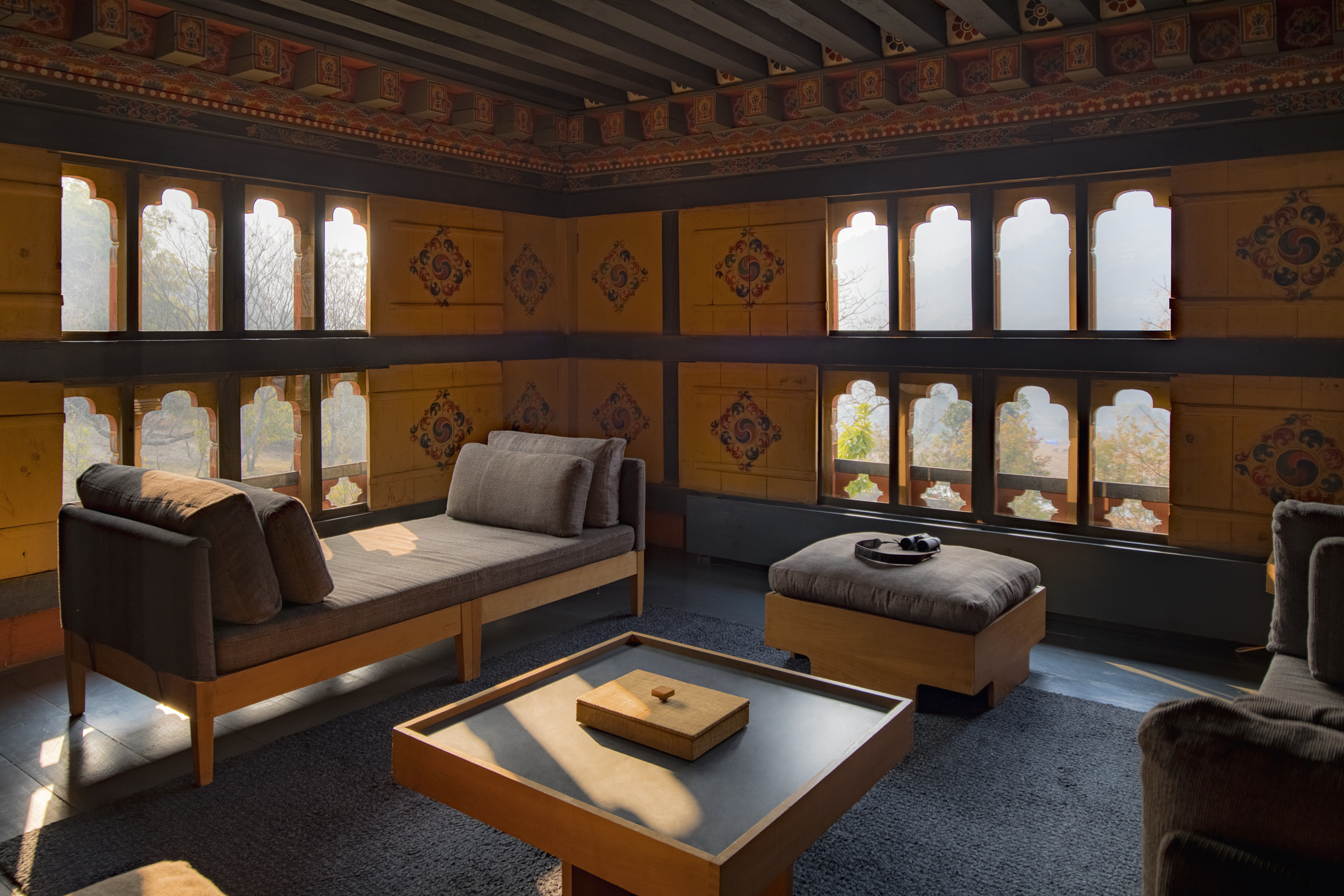 Situated east of the Dochula pass and just north of the impressive Punakha Dzong, Amankora Punakha is accessible by crossing a suspension bridge over the Mo Chhu (Mother River). The lodge includes a traditional Bhutanese farmhouse built as a residence by a previous Je Khenpo (spiritual and religious leader). This grand structure, with its preserved vegetable dye wall paintings, houses the dining room and, intimate relaxation area as well as the traditional altar room for meditation. The courtyard is suitable for outdoor dining and relaxation in Punakha’s temperate climate. Other facilities include a tea pavilion that was once the kitchen of the summer palace, and beyond is the yoga/meditation room with open views of the surrounding rice terraces and orchards. The suites provide king-size beds, a traditional bukhari (wood-burning stove), and a large terrazzo-clad bath. The lodge facility includes a living room, dining room, library, and outdoor terrace, all warmed by fireplaces.