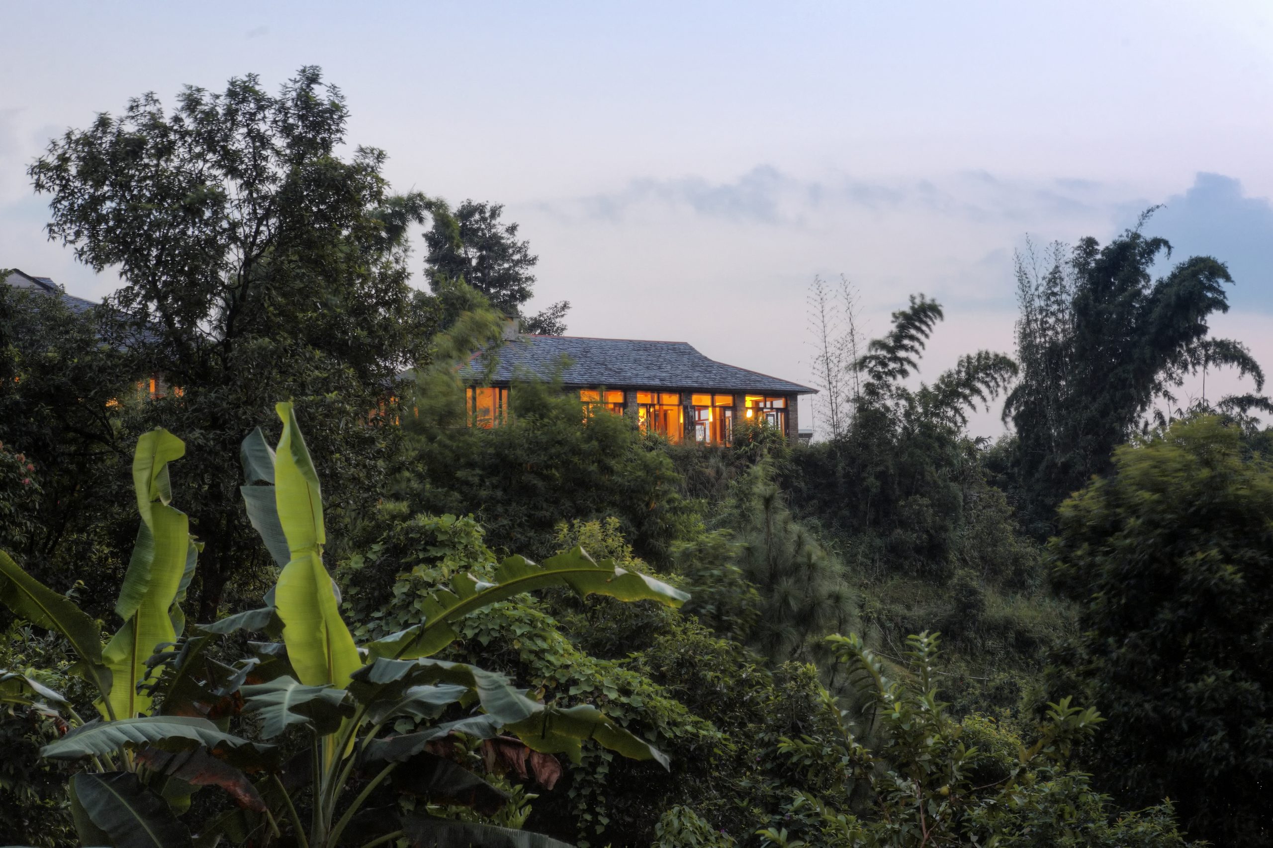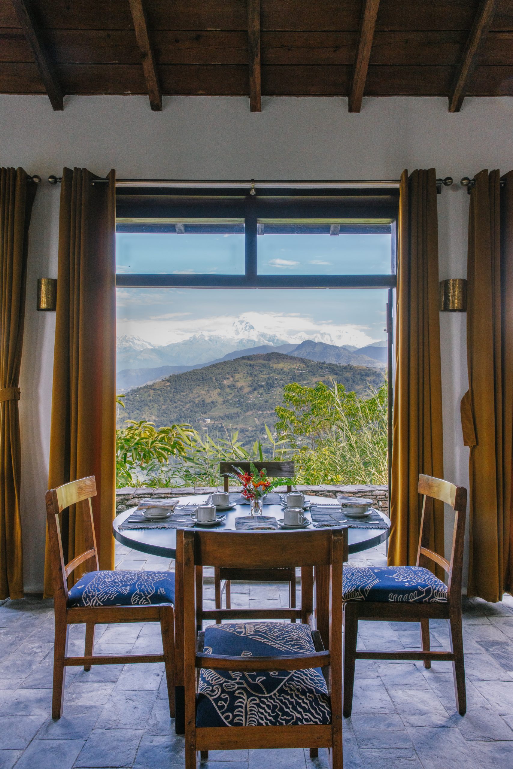 Tiger Mountain Pokhara Lodge is located on a hilltop ridge just a short drive from Pokhara, offering wide views of Machhapuchhare and the Himalayan peaks of Dhaulagiri, Annapurna, and Manaslu. The lodge is built from hand-cut stone and set among gardens that blend naturally into the surrounding landscape. Each cottage has a private veranda and interiors that reflect local style, creating a simple yet comfortable retreat.